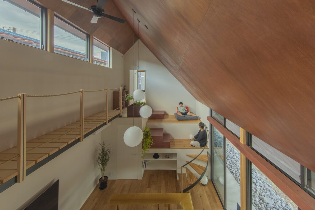 生活時間の違いによりプライバシーが求められた4つの個室については、リビングを住まいの中心に配置し1、2階の両端に個室を置くことにより部屋同士に距離を持たせました。部屋の前にはそれぞれ+αの前室のようなスペースを設け、各個室の延長として、もしくはリビングの一部としても使える中間的なスペースを提案しています。高低差を利用したこのスペースは、リビングと個室とを柔らかく繋ぎ、家族間に適度な距離をつくりだします。季節や気分によってそれぞれが好きな場所を見つけてお弁当を食べる公園、広場のような位置付けとして考えました。