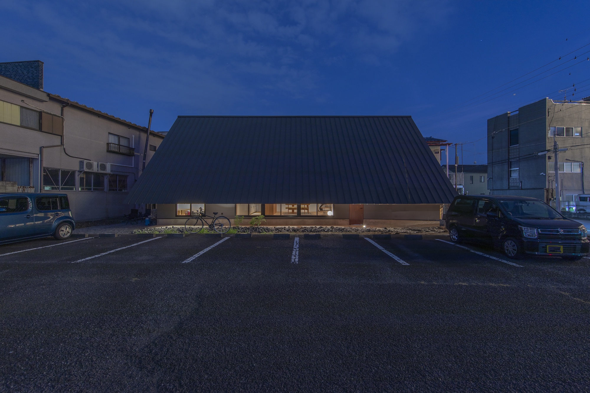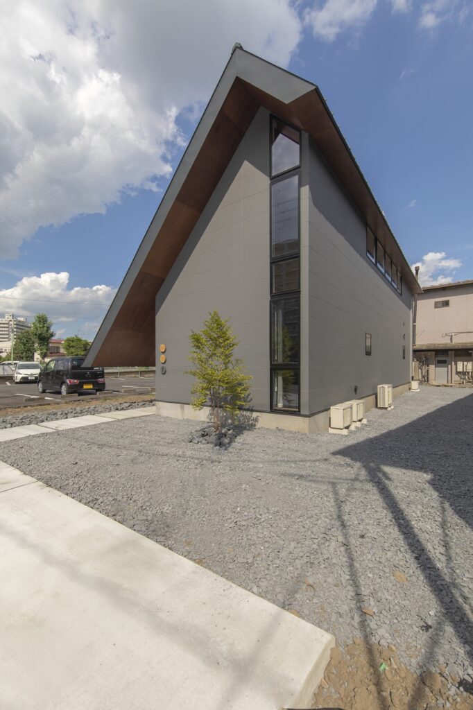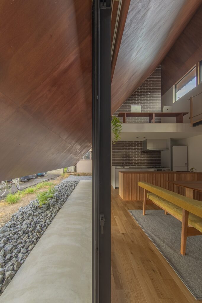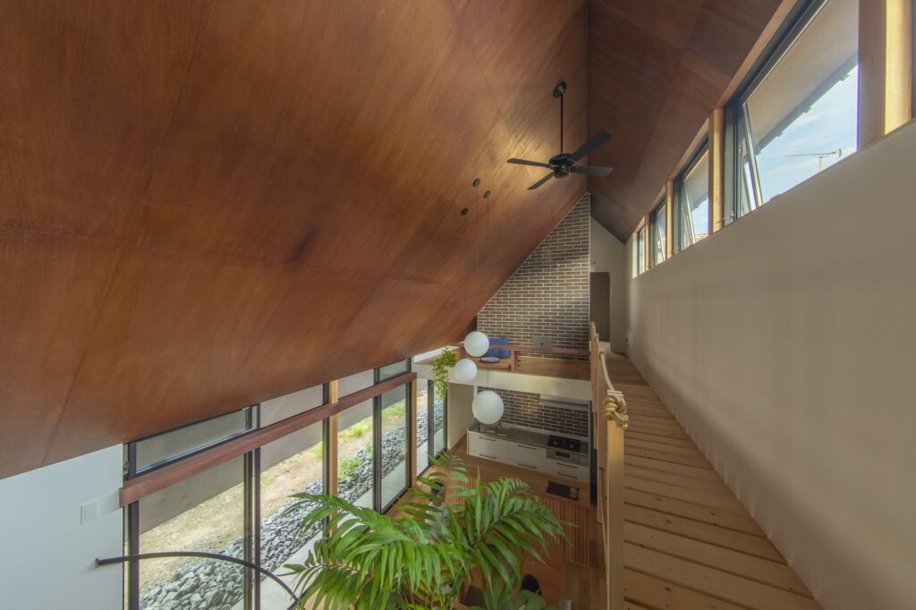 窓を開けてたくさんの風を取り込みたいという要望に対し、南側2階の高窓から北側1階の掃き出し窓へ高低差を利用した換気を促す形状を提案し、その形状が外観にもそのまま現れるようにしています。大きく跳ね出した軒下は外観を特徴づけるとともに北側にある県道からの視線や騒音を遮る役割も担いながら、室内と連続する天井材が内外を一体的につなぎ、軒下空間までを室内として認識させることでプライバシーに配慮しつつも広がりあるLDKを実現しました。