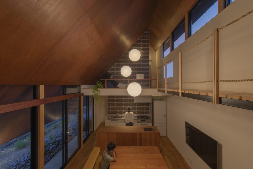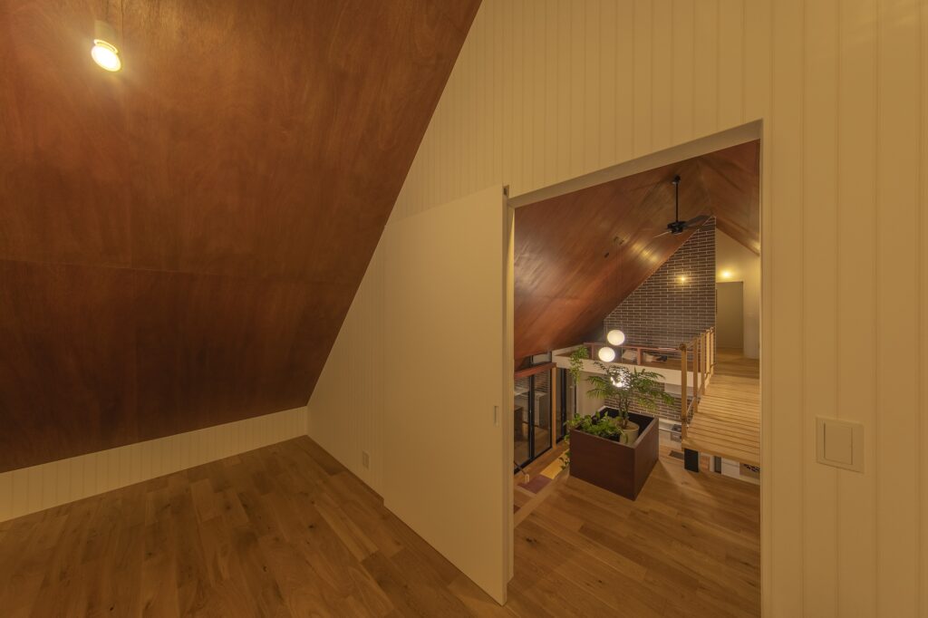 大きな屋根のおかげで、天候に関係なく心地よい風を供給でき、さらに掃き出し窓上部の欄間窓が夜間を通して安心感のある風の流れを作りだします。