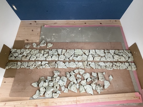 これは以前、大谷石の採石場で手に入れた石のかけらです。こちらを客室の壁に張っていきます!