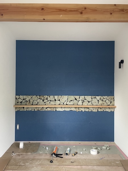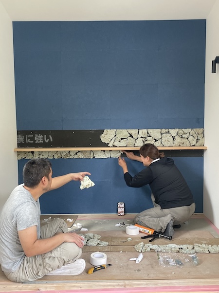 石を張ること数時間。なんとか無事張り終わりました!直線ですしすぐ終わるのかと思いきや舐めてましたね。1日がかりの作業となりました。ただ、出来栄えには大満足です。大谷石と烏山和紙、どちらも栃木県の材料ですので相性はバッチリですね!