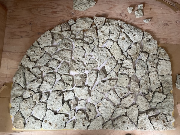 まず石を張る部分の型をつくり石のサイズや形を選びながら綺麗に並べていきます。この作業をしないでいきなり壁に張ることは素人では難しいと思います。並べ終わったら写真を撮りその写真を頼りに壁に張っていきます。