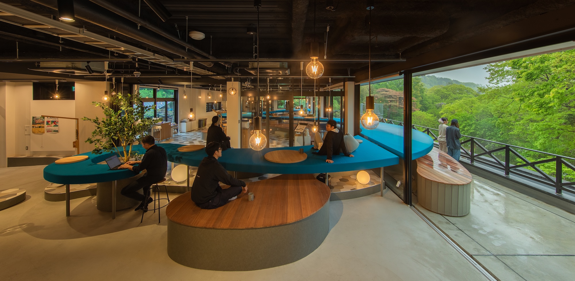 大きな川で魚釣りをするように好きな場所を見つけてくつろげます。魚釣りは高いところから、川付近で、川の中からそして船からなど地形を読み取りながら気分で楽しみますよね、ここでも同じように椅子やテーブルなど決まった関係をつくらず使う用途や季節、気分に応じて心地よい居場所を見つけてくつろぐことができます。時には地面が座面になったりテーブルが座面になったり変化を繰り返します。