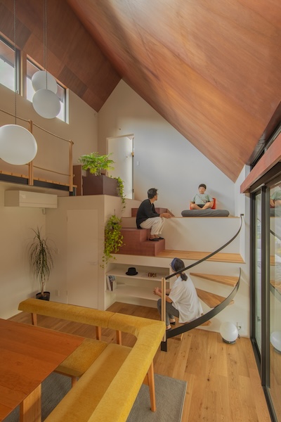 そんなリビングで私が大切にしていることは、距離感です。『高窓の家』ではリビングから個室の間に居場所を配置して好きな距離をはかれるように計画しました。L型のソファに座って話すのと階段に座って話すのでは気持ち的に変わってくると思います。同様に1段目の踊り場、2段目の踊り場、高さが変わり気持ちに距離がうまれます。
