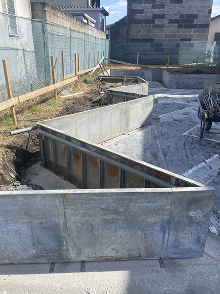 角という角すべてのポイントを図面に書き入れそれを繋いで型枠をたてていきます。うねうねだらけでここまでくるのに3日かかってしまいました。